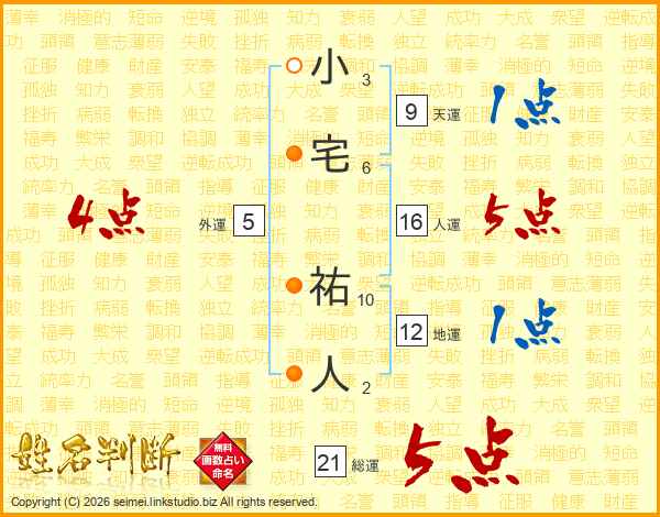 生活面を象徴する運勢です。外部から受ける影響力を表し、結婚運、家庭運や職場、環境への順応性を表します。総運から人運を引いた画数。姓や名が1文字の場合を除く。