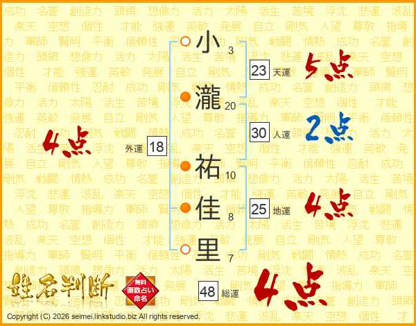 小(3画)瀧(20画) 祐(10画)佳(8画)里(7画)