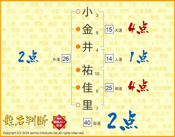 小(3画)金(8画)井(4画) 祐(10画)佳(8画)里(7画)