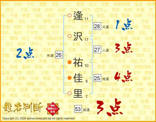 逢(11画)沢(17画) 祐(10画)佳(8画)里(7画)