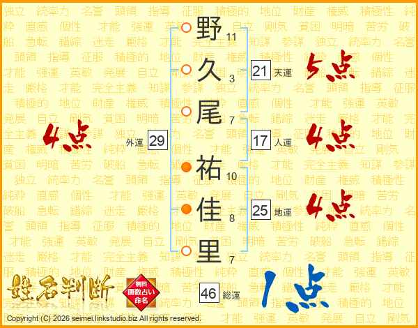 野久尾祐佳里さんの総運は46画の1点!