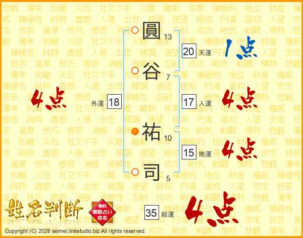 圓(13画)谷(7画) 祐(10画)司(5画)