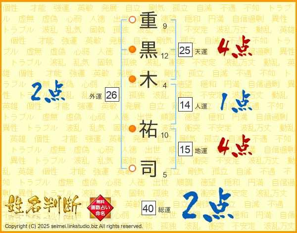 重(9画)黒(12画)木(4画) 祐(10画)司(5画)