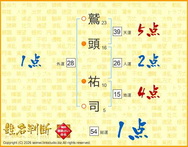 鷲(23画)頭(16画) 祐(10画)司(5画)