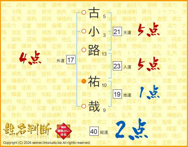 古(5画)小(3画)路(13画) 祐(10画)哉(9画)