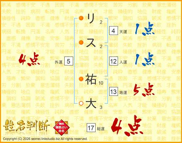 リス祐大さんの総運は17画の4点!
