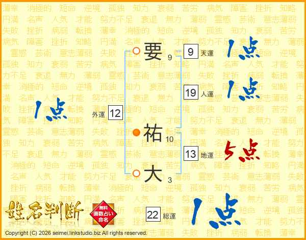 生活面を象徴する運勢です。外部から受ける影響力を表し、結婚運、家庭運や職場、環境への順応性を表します。総運から人運を引いた画数。姓や名が1文字の場合を除く。