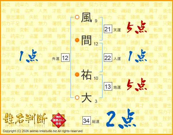 あなたの人生を表す1番重要な運勢です。生涯を通じて影響する総合運となり、主に50歳以降の晩年期に影響を及ぼします。苗字と名前の合計画数。