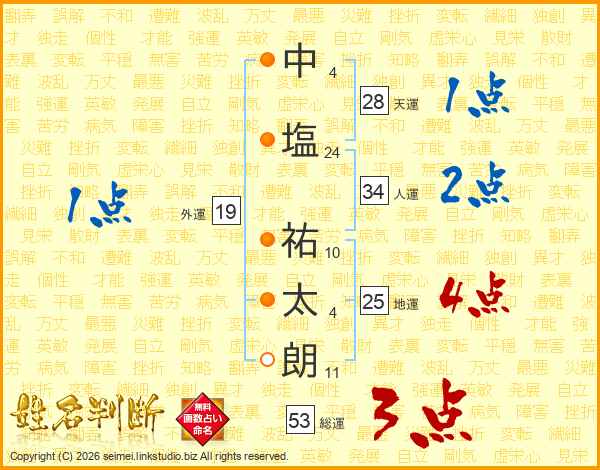 中(4画)塩(24画) 祐(10画)太(4画)朗(11画)
