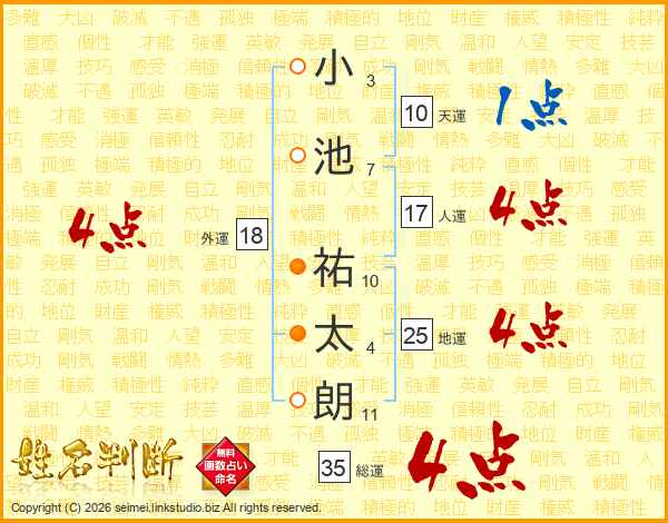 小(3画)池(7画) 祐(10画)太(4画)朗(11画)