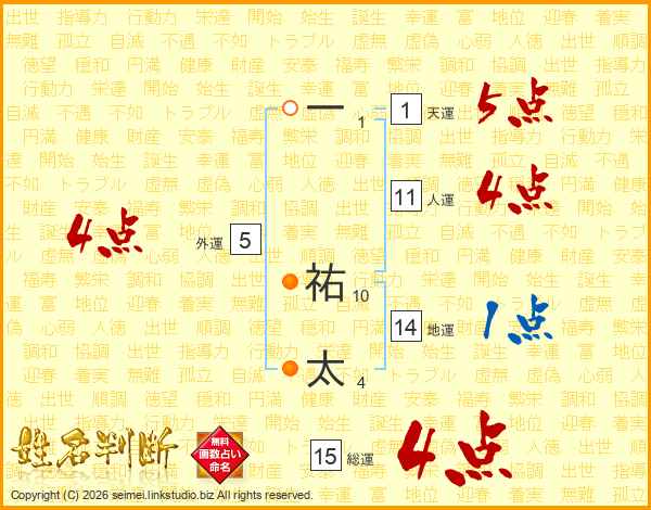 生活面を象徴する運勢です。外部から受ける影響力を表し、結婚運、家庭運や職場、環境への順応性を表します。総運から人運を引いた画数。姓や名が1文字の場合を除く。