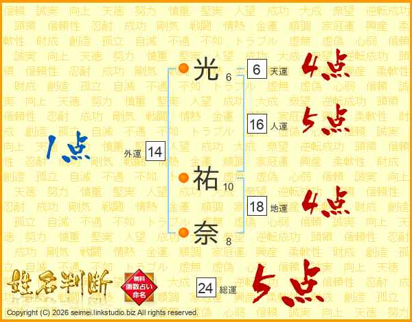 生活面を象徴する運勢です。外部から受ける影響力を表し、結婚運、家庭運や職場、環境への順応性を表します。総運から人運を引いた画数。姓や名が1文字の場合を除く。