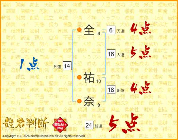 生活面を象徴する運勢です。外部から受ける影響力を表し、結婚運、家庭運や職場、環境への順応性を表します。総運から人運を引いた画数。姓や名が1文字の場合を除く。