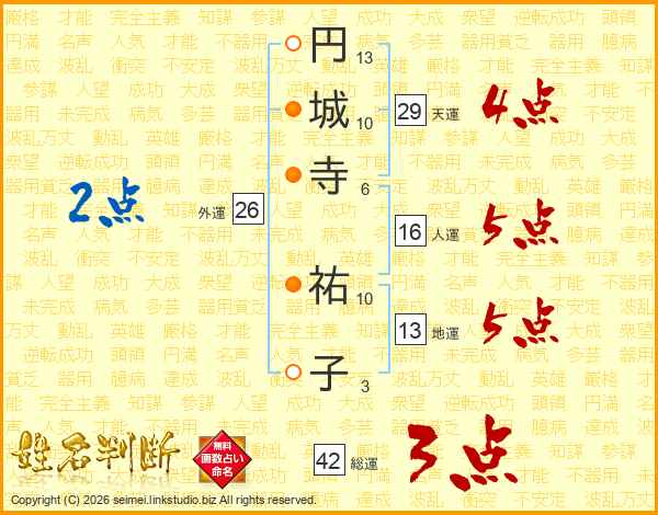 円(13画)城(10画)寺(6画) 祐(10画)子(3画)