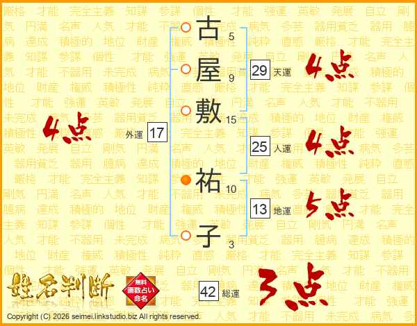 古(5画)屋(9画)敷(15画) 祐(10画)子(3画)