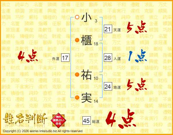 小(3画)櫃(18画) 祐(10画)実(14画)