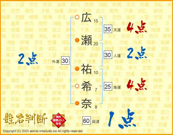 広(15画)瀬(20画) 祐(10画)希(7画)奈(8画)