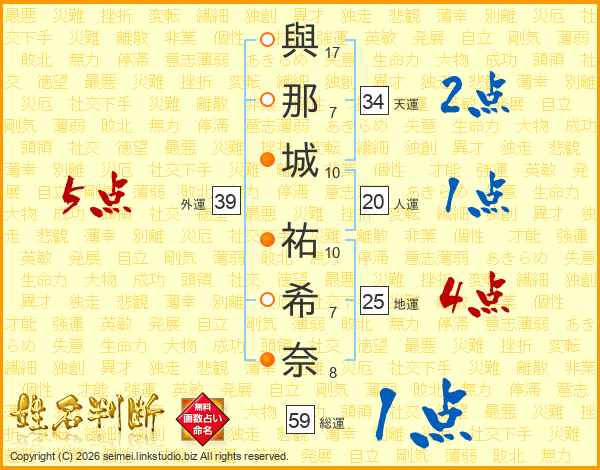 與(17画)那(7画)城(10画) 祐(10画)希(7画)奈(8画)