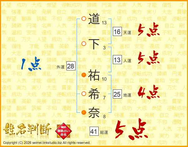 道(13画)下(3画) 祐(10画)希(7画)奈(8画)