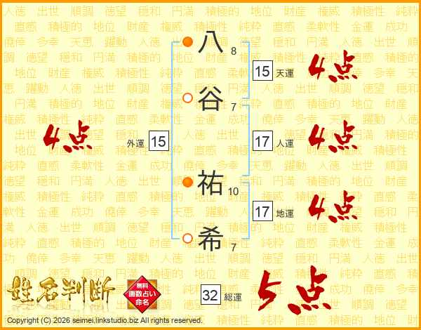 八(8画)谷(7画) 祐(10画)希(7画)