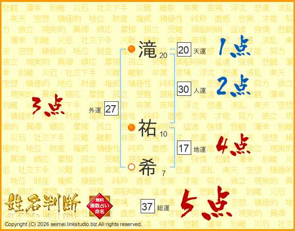 画数の奇数(○陽)と偶数(●陰)の配列で吉凶を占います。どちらかにかたよる名前は大凶名で避ける必要があります。画数の奇数偶数。