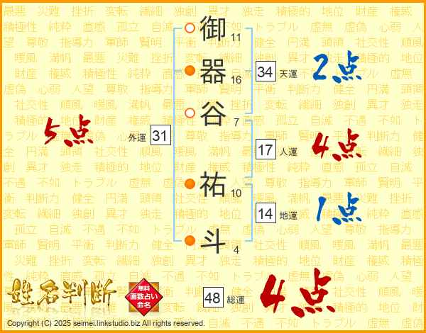 御(11画)器(16画)谷(7画) 祐(10画)斗(4画)