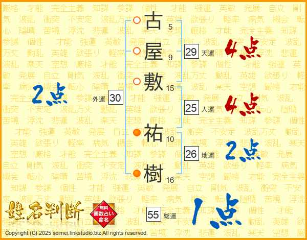 古(5画)屋(9画)敷(15画) 祐(10画)樹(16画)