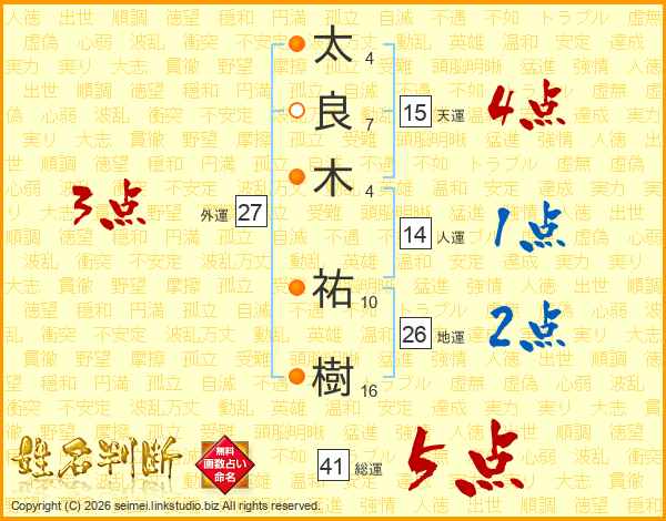 太(4画)良(7画)木(4画) 祐(10画)樹(16画)