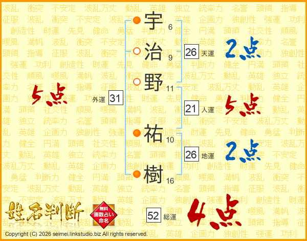 宇(6画)治(9画)野(11画) 祐(10画)樹(16画)