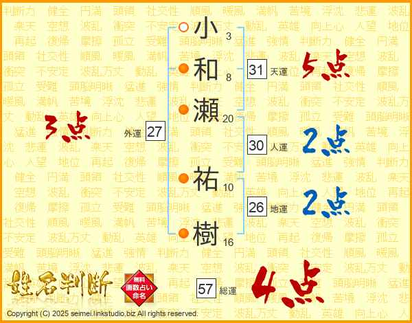 小(3画)和(8画)瀬(20画) 祐(10画)樹(16画)