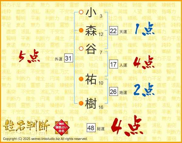小(3画)森(12画)谷(7画) 祐(10画)樹(16画)