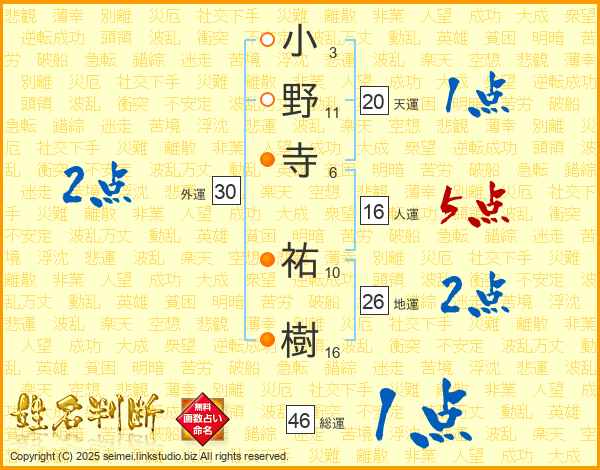 小(3画)野(11画)寺(6画) 祐(10画)樹(16画)