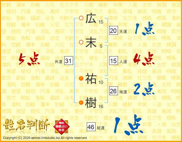 生活面を象徴する運勢です。外部から受ける影響力を表し、結婚運、家庭運や職場、環境への順応性を表します。総運から人運を引いた画数。姓や名が1文字の場合を除く。