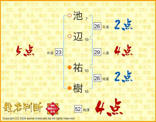 池(7画)辺(19画) 祐(10画)樹(16画)