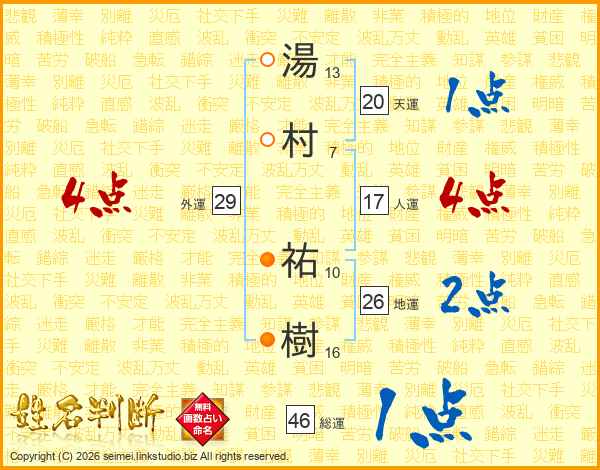 湯(13画)村(7画) 祐(10画)樹(16画)