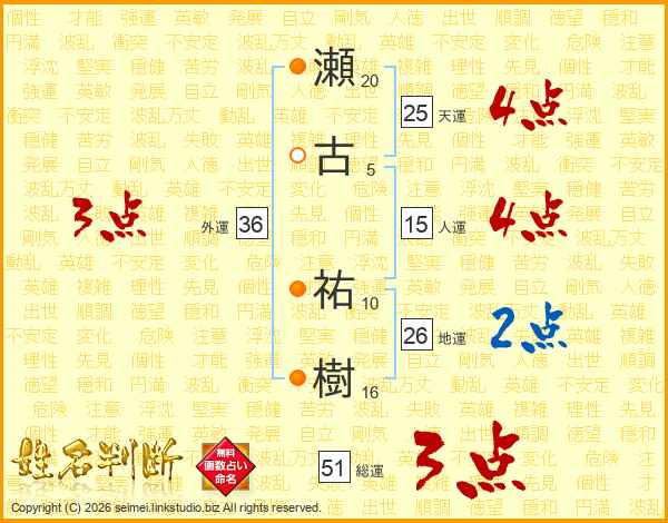 瀬(20画)古(5画) 祐(10画)樹(16画)
