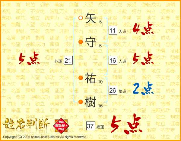 矢(5画)守(6画) 祐(10画)樹(16画)
