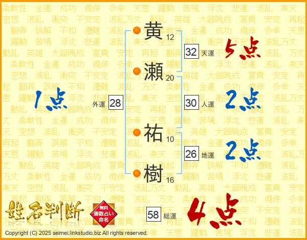 黄(12画)瀬(20画) 祐(10画)樹(16画)