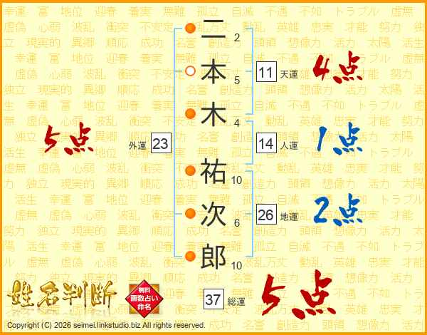 二(2画)本(5画)木(4画) 祐(10画)次(6画)郎(10画)