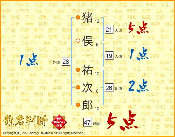 猪(12画)俣(9画) 祐(10画)次(6画)郎(10画)