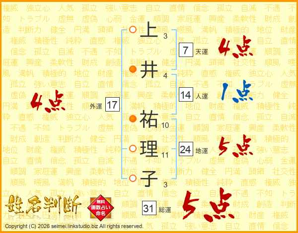 上(3画)井(4画) 祐(10画)理(11画)子(3画)