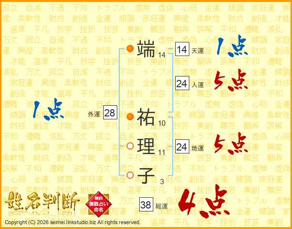 端(14画) 祐(10画)理(11画)子(3画)