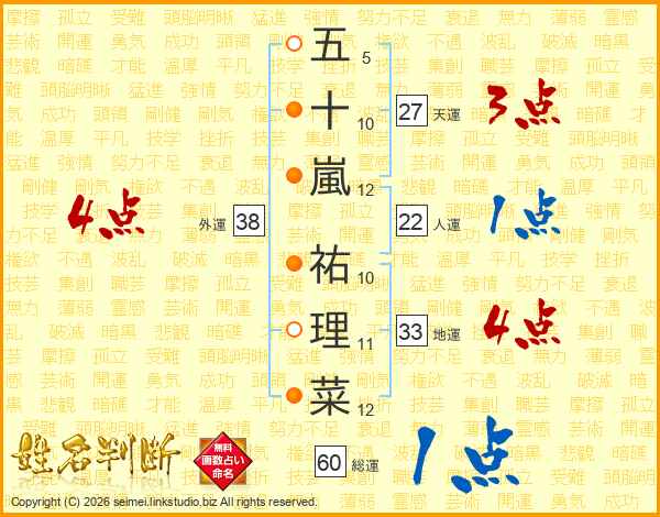 五(5画)十(10画)嵐(12画) 祐(10画)理(11画)菜(12画)
