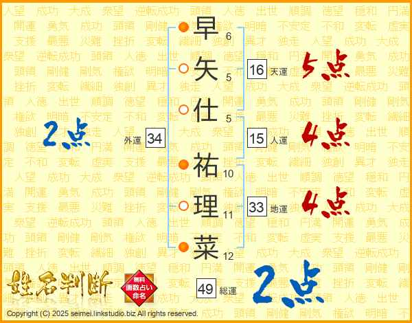 早(6画)矢(5画)仕(5画) 祐(10画)理(11画)菜(12画)