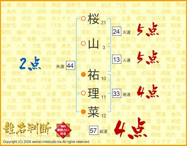 桜(21画)山(3画) 祐(10画)理(11画)菜(12画)