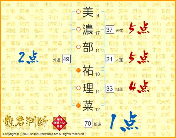 美(9画)濃(17画)部(11画) 祐(10画)理(11画)菜(12画)
