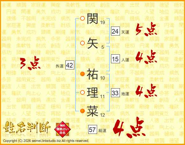 関(19画)矢(5画) 祐(10画)理(11画)菜(12画)