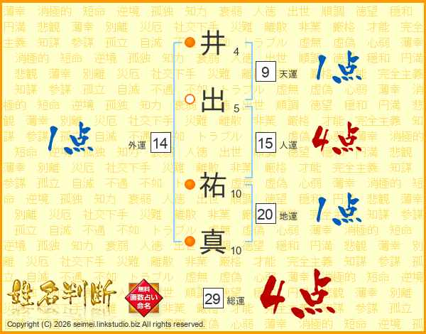 生活面を象徴する運勢です。外部から受ける影響力を表し、結婚運、家庭運や職場、環境への順応性を表します。総運から人運を引いた画数。姓や名が1文字の場合を除く。