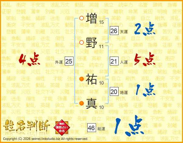 生活面を象徴する運勢です。外部から受ける影響力を表し、結婚運、家庭運や職場、環境への順応性を表します。総運から人運を引いた画数。姓や名が1文字の場合を除く。