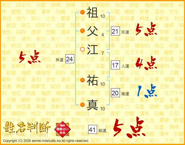 祖父江祐真さんの総運は41画の5点!